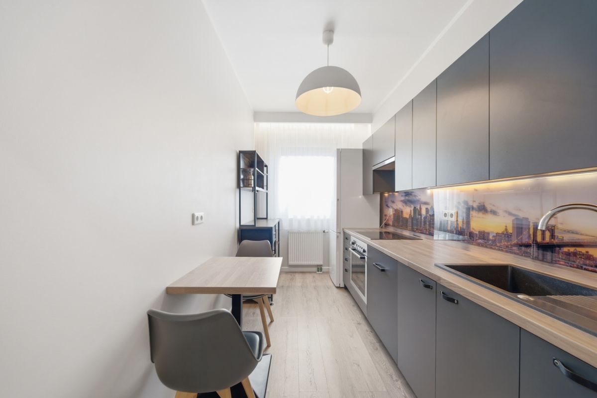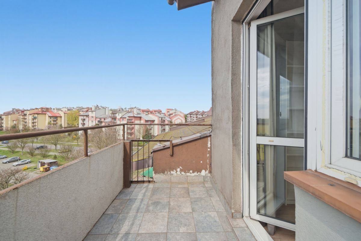 Dwa przestronne pokoje z dużym balkonem i widokiem. Wyposażenie mieszkania w cenie.