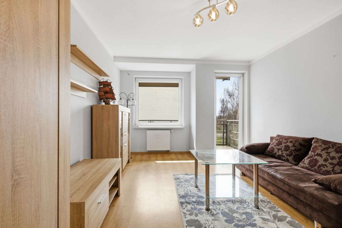 Powierzchnię mieszkania (~50m²) stanowią: • Salon z wyjściem na duży balkon, • Pokój / sypialnia, • Kuchnia, • Przedpokój, • Łazienka z WC.